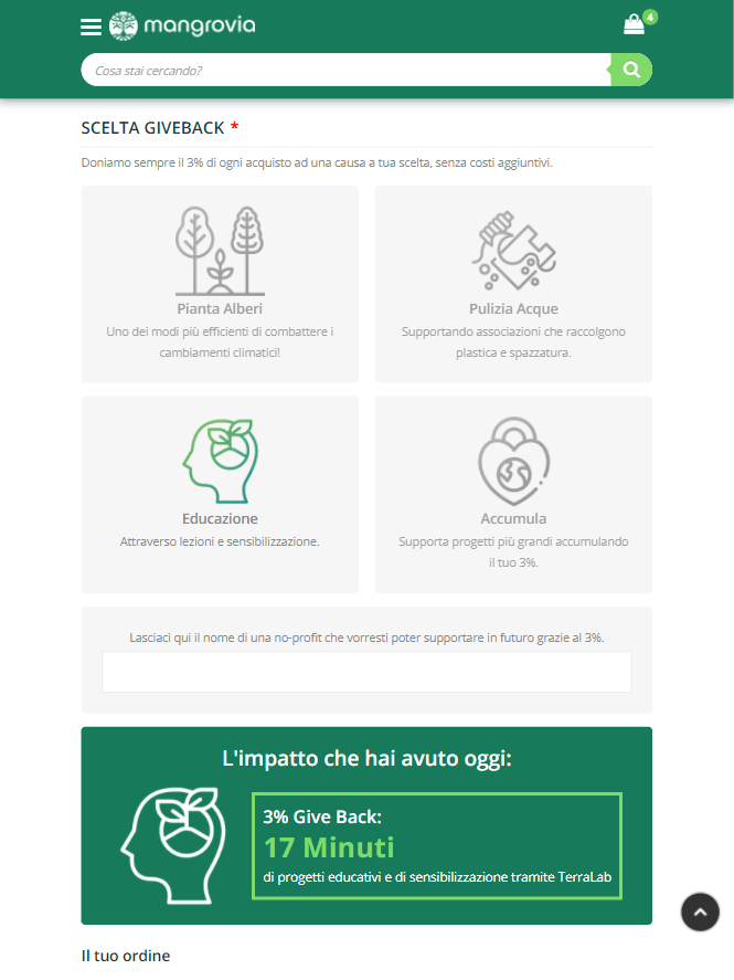 G: Stiamo lavorando sodo per creare una realtà davvero diversa dalle altre, una delle prime funzioni che abbiamo sviluppato infatti è quella del 3% Giveback: doniamo il 3% di ogni ordine ad una no-profit scelta dal cliente durante il checkout. Non bisogna fare altro che aggiungere i prodotti al carrello, arrivare al checkout e scegliere la categoria che si vuole supportare, a questo punto si avrà una stima del contributo che abbiamo apportato con il nostro acquisto.